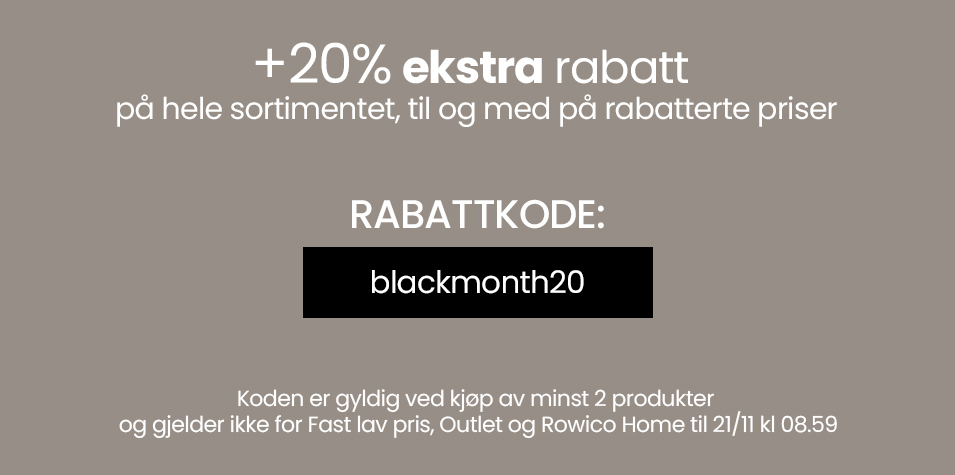 Skriv inn rabattkoden blackmonth20 i kassen og få ytterligere 20% rabatt på hele sortimentet, til og med rabatterte priser. Koden er gyldig ved kjøp av minst 2 produkter og gjelder ikke for Fast lav pris, Outlet og Rowico Home.