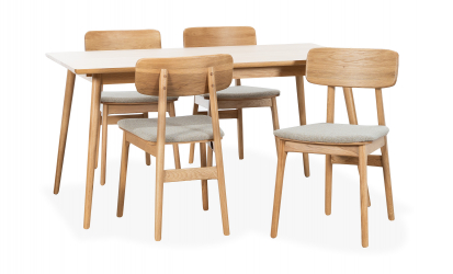Forny spiseplassen din med vårt stilige Blanca 150/Lino spisegruppe. Blanca spisebord er en vakker møbel i eik og eikefiner som utstråler en tidløs stil og kvalitet. Bordet har rette, lett skrånende ben og har plass til ileggsplate på bordets kant. Lino er en stilig og komfortabel spisestol i massiv eik. Stolen er designet med et sete i et herlig stoff som gir en myk sittekomfort.