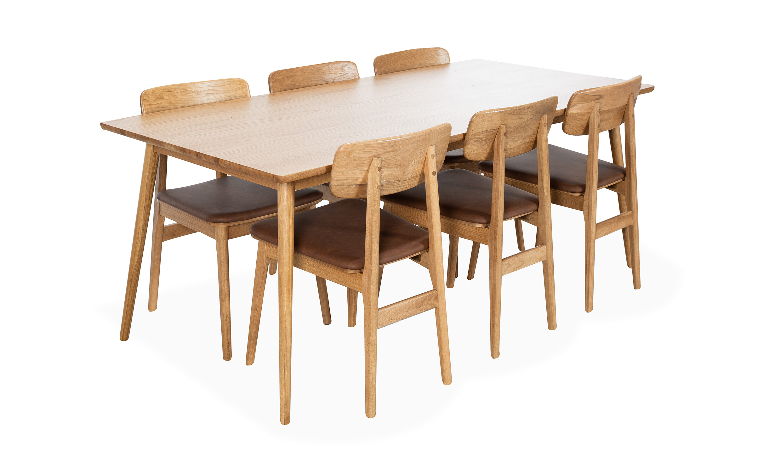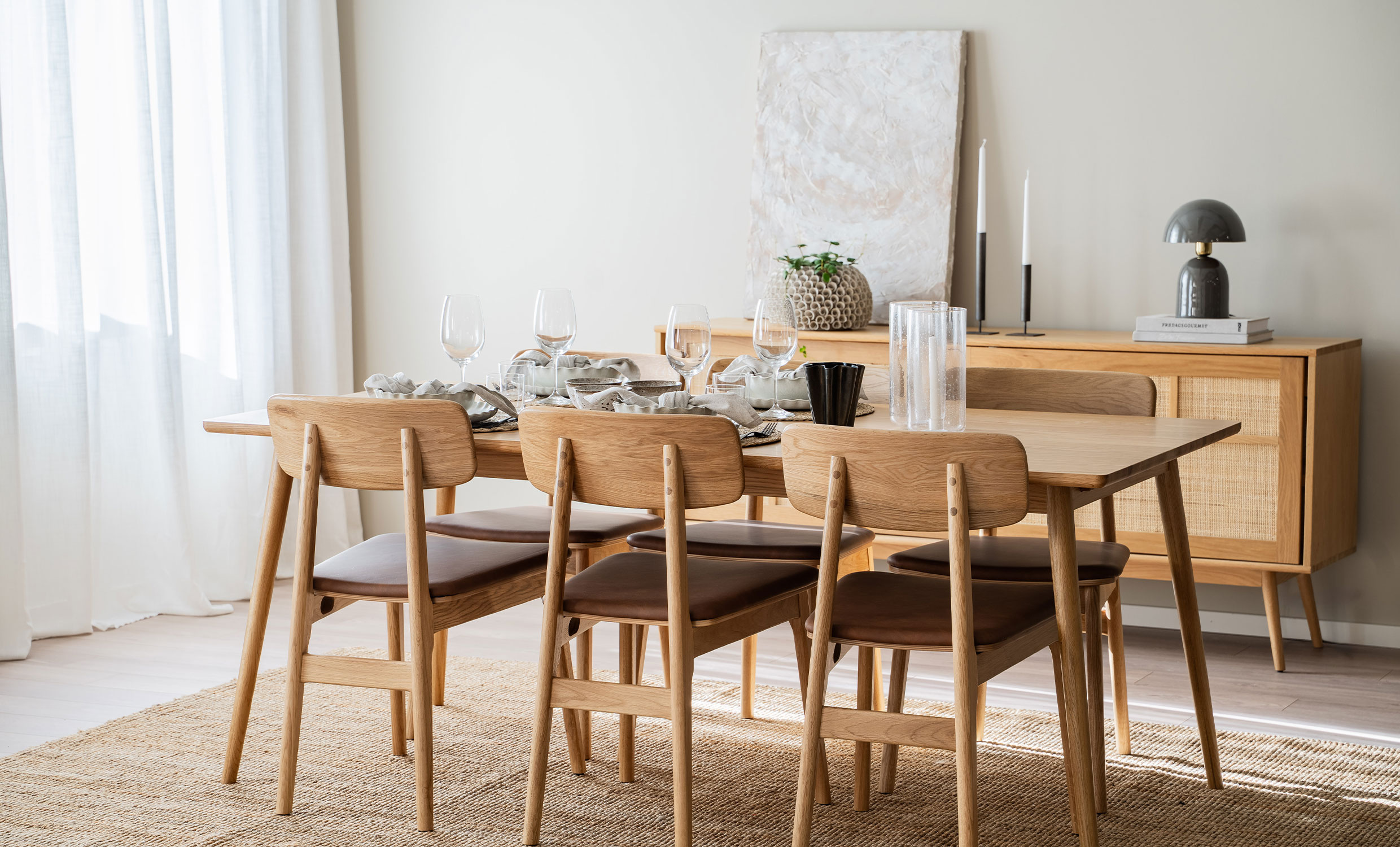 - Stolene er laget av heltre eik med et sete trukket i 100% polyesterstoff.