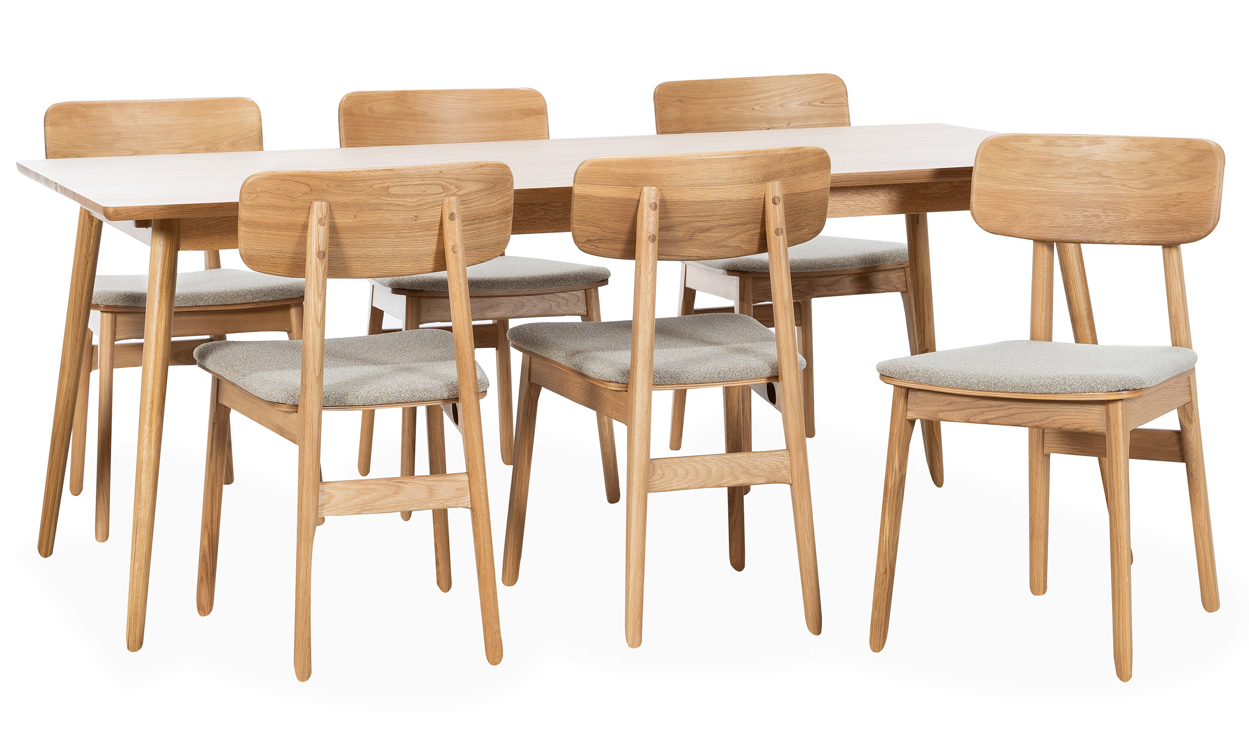 - Stolene er laget av heltre eik med et sete trukket i 100% polyesterstoff.