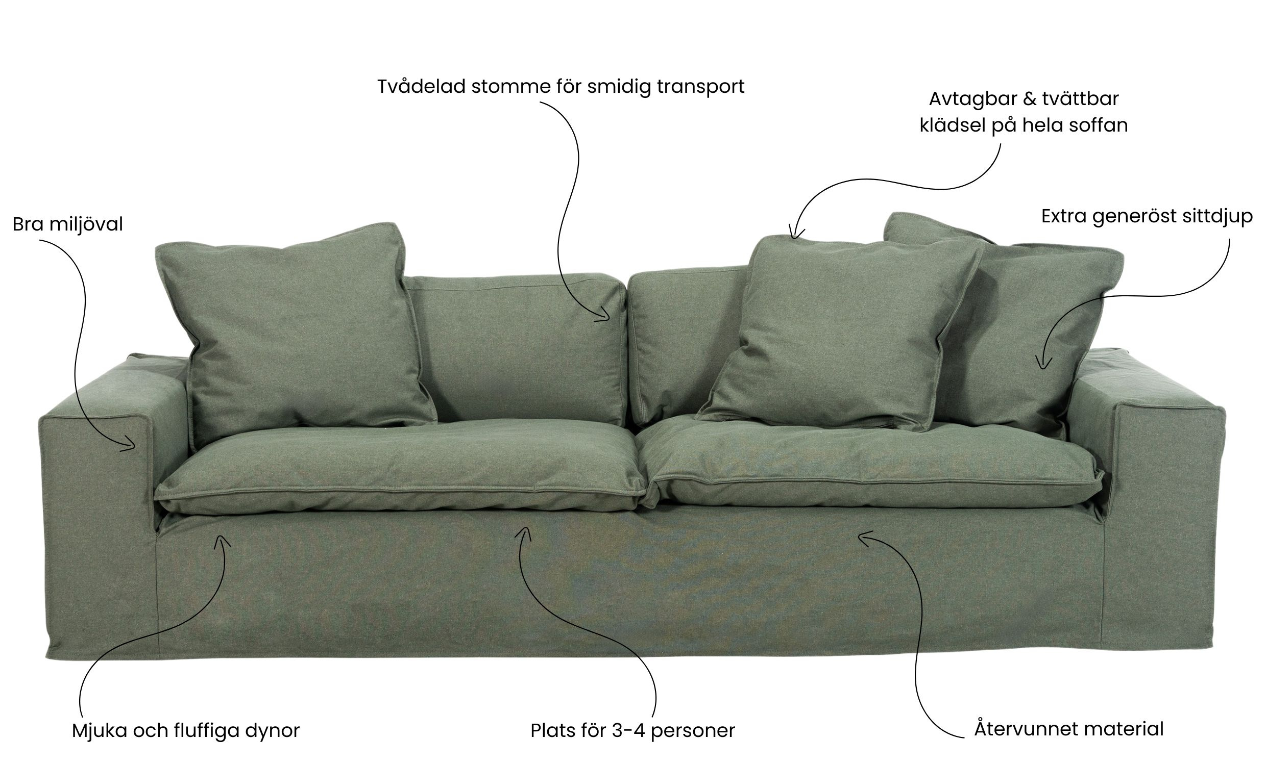 - Trekket i 75 % resirkulert bomull og 25 % polyester, et formbevarende og slitesterkt materiale med en myk og deilig linfølelse. Stoffet har en loose fit-effekt, det vil si litt løs passform, noe som bidrar enda mer til linfølelsen.