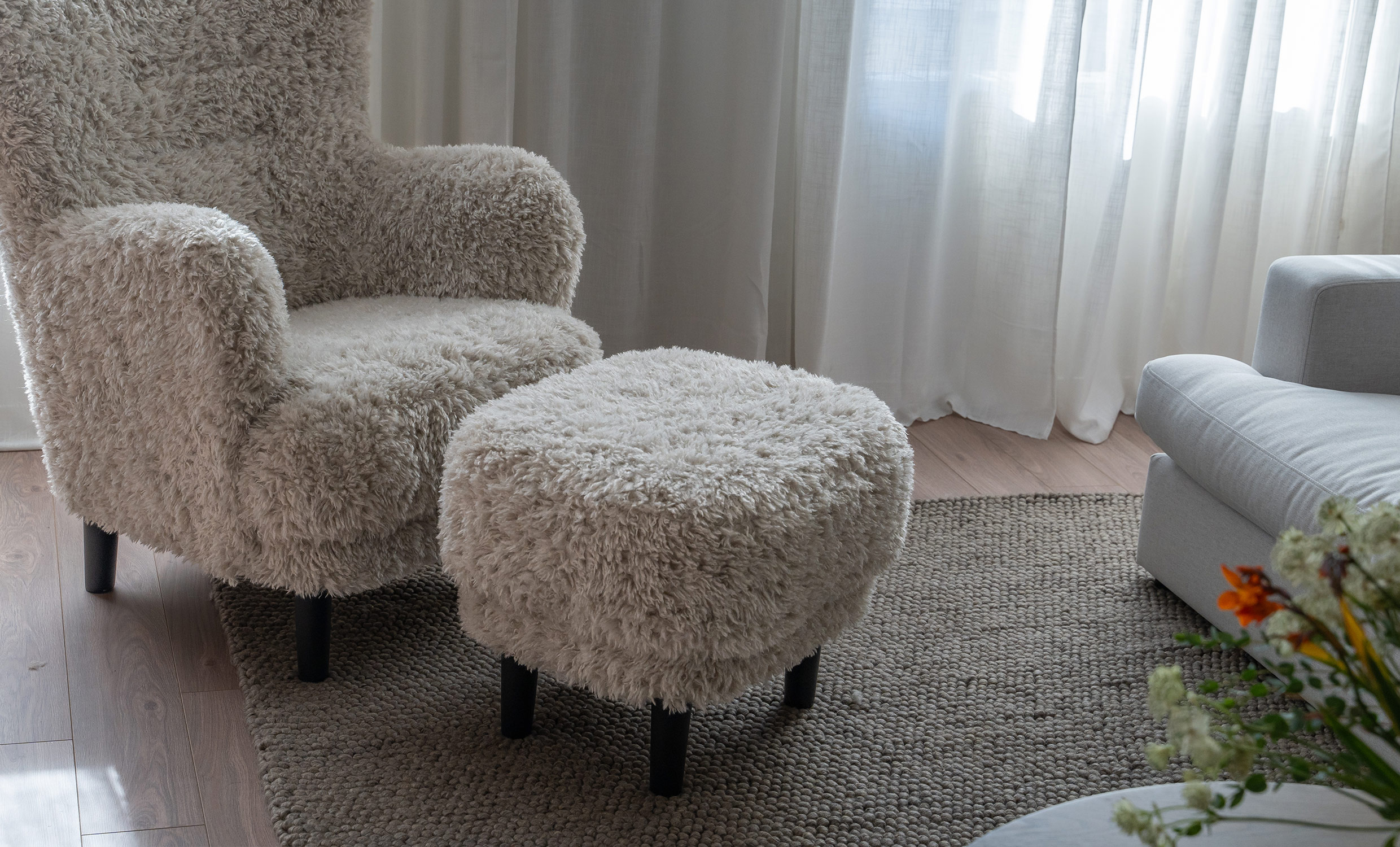- Lova lenestol og fotpall har en fast komfort, og er kledd i et stoff med fluffy overflate.