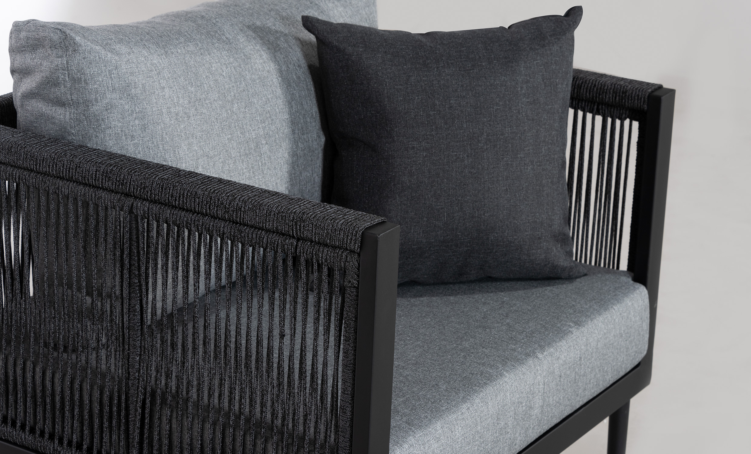Lugano er en nydelig hagestol som er perfekt for å tilbringe fritiden i vinterhagen eller hagen. Rammen består av tau og galvanisert stål. Putene og putene er dekket av et polyesterstoff.