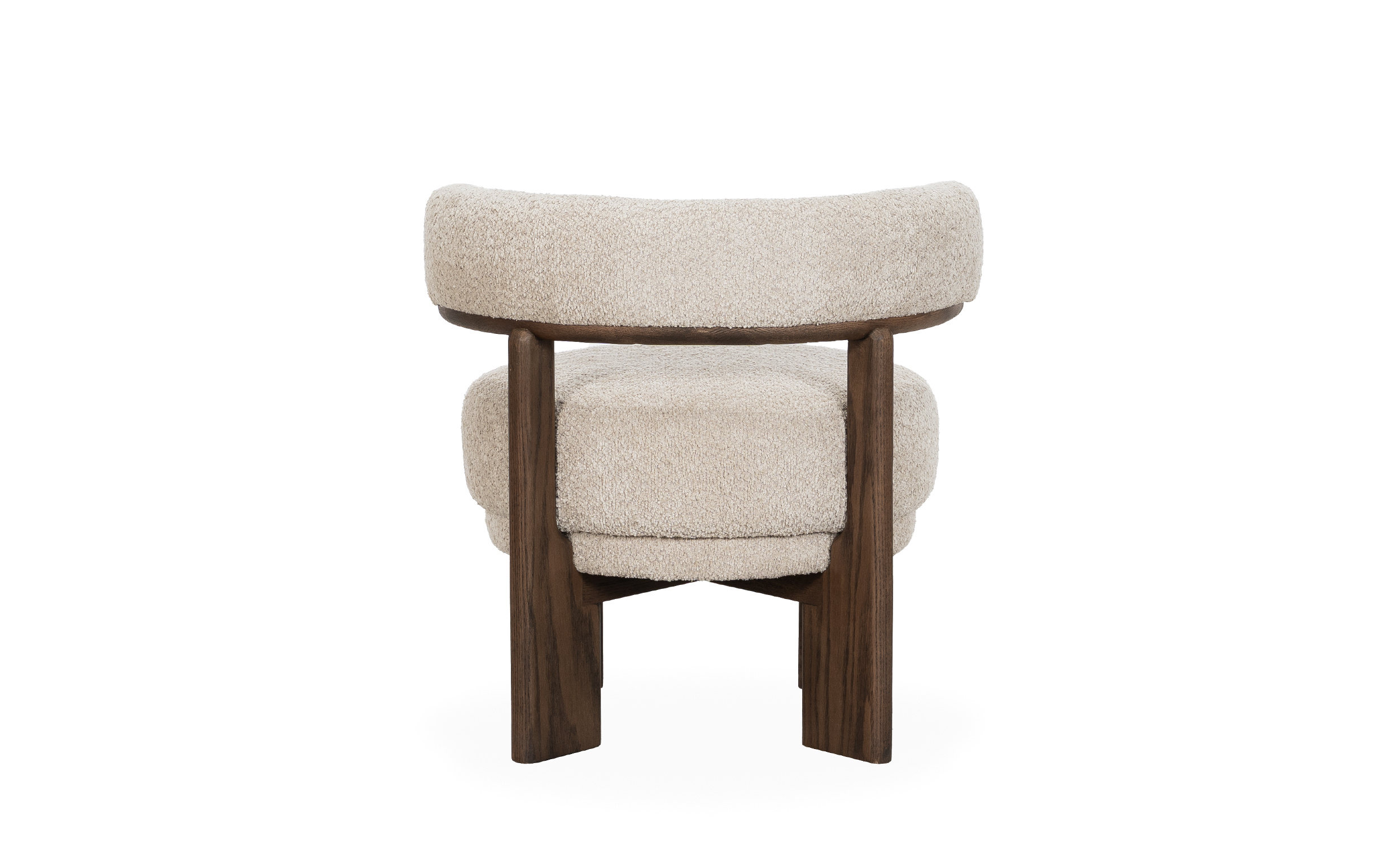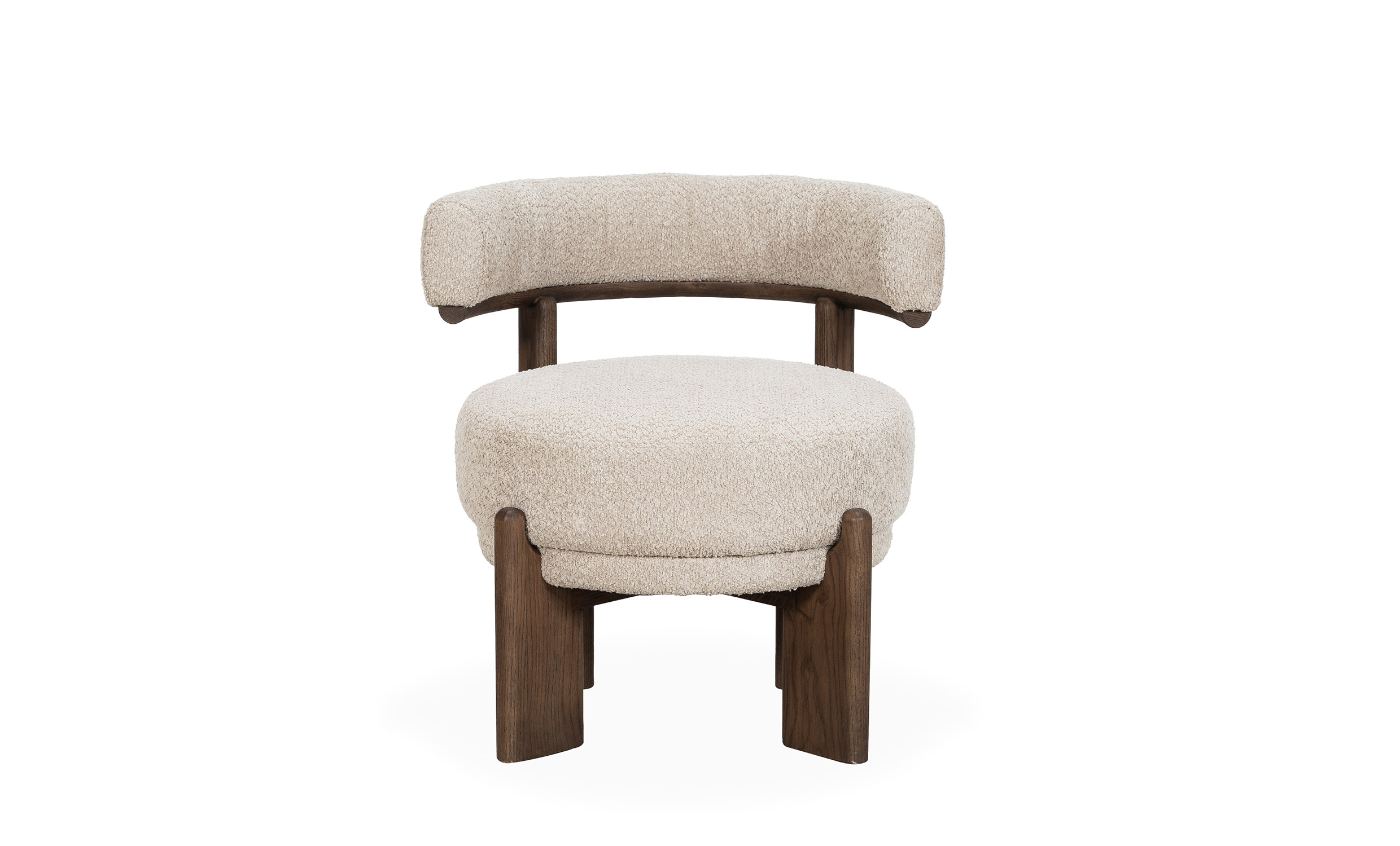 Noda er en nydelig lenestol med komfortabelt stoff som inviterer deg til å slappe av. Den avrundede ryggen og de naturlige trebena skaper en harmonisk balanse mellom komfort og estetikk. Noda passer perfekt i stuen, soverommet eller salongen.