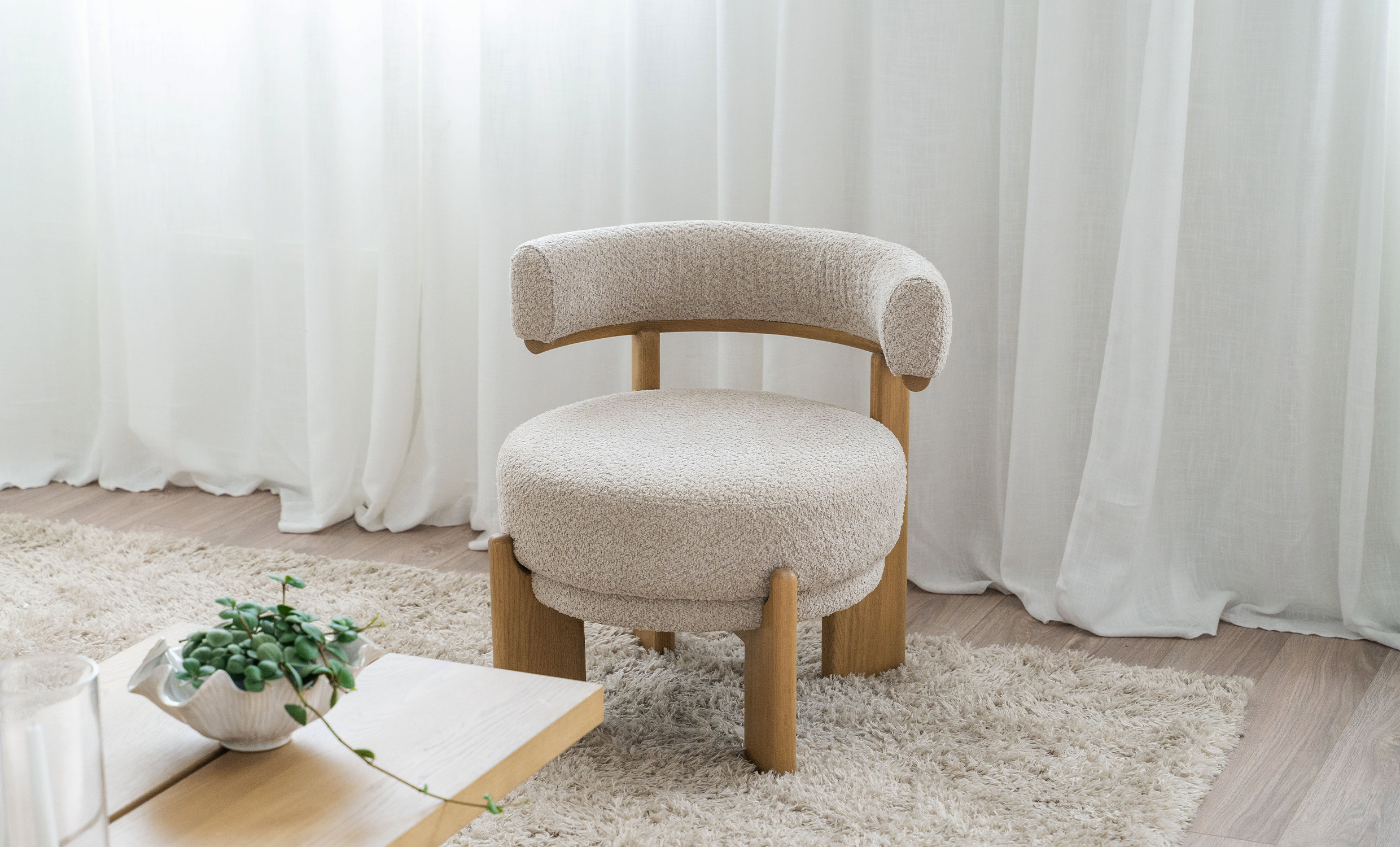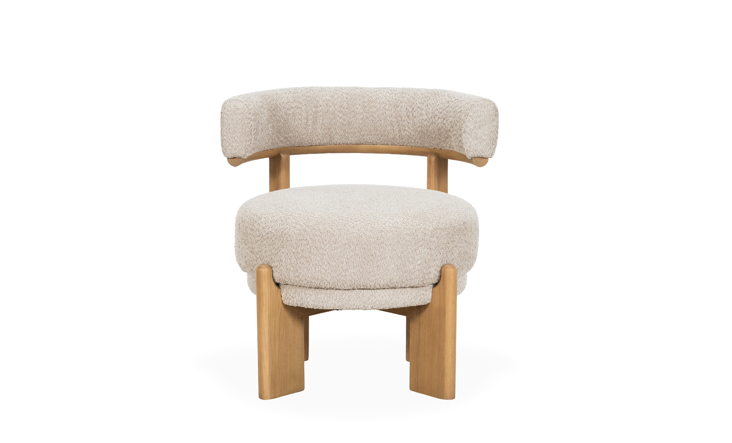 Noda er en nydelig lenestol med komfortabelt stoff som inviterer deg til å slappe av. Den avrundede ryggen og de naturlige trebena skaper en harmonisk balanse mellom komfort og estetikk. Noda passer perfekt i stuen, soverommet eller salongen.
