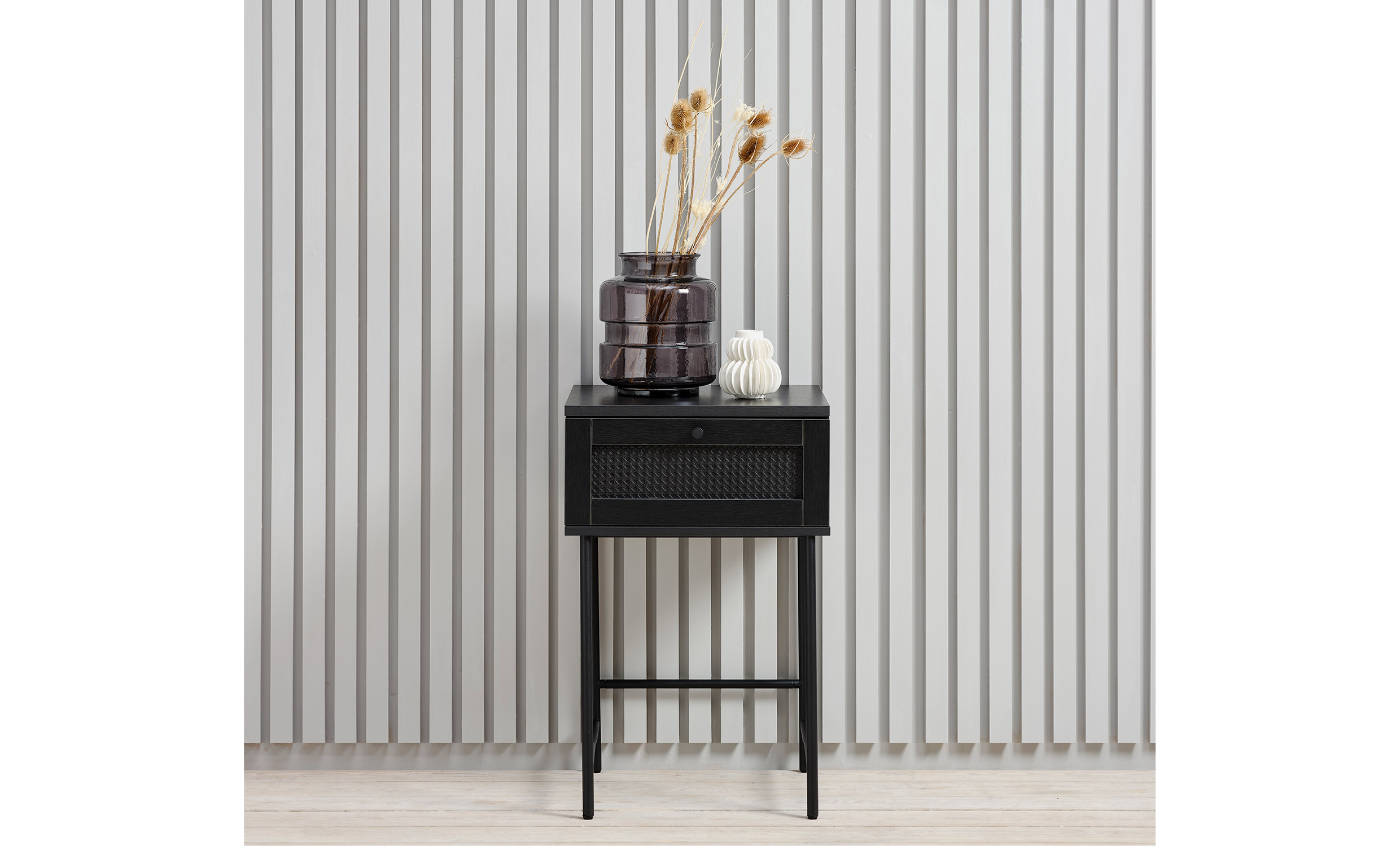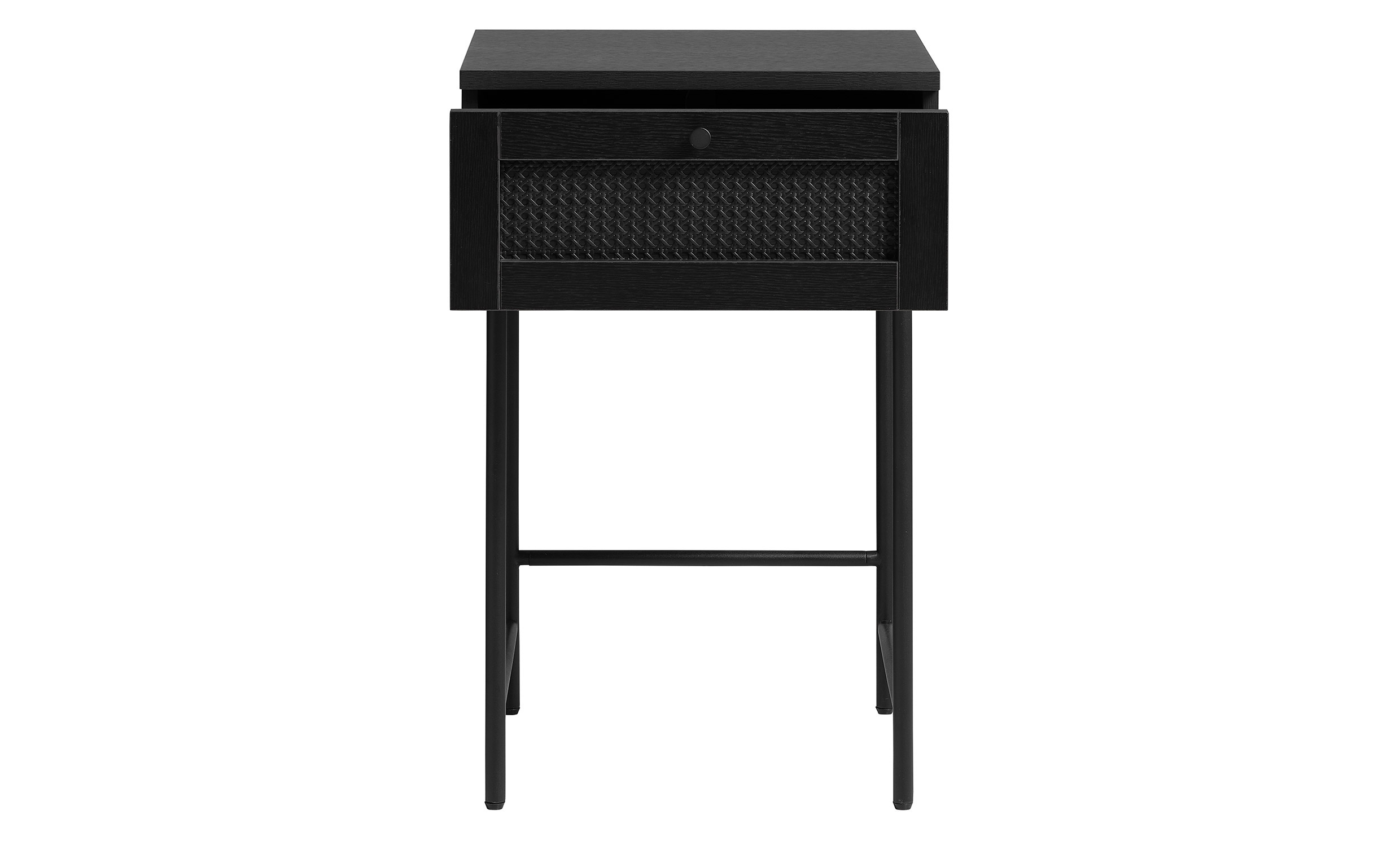 Dette sengebordet er en stilren møbel med moderne toner. Sengebordet er laget i eikemelamin og MDF med ben laget i metall og en skuff i polyrotting som gir en naturnær følelse. Bordet passer fint i soverom som sengebord eller ved siden av lenestolen.