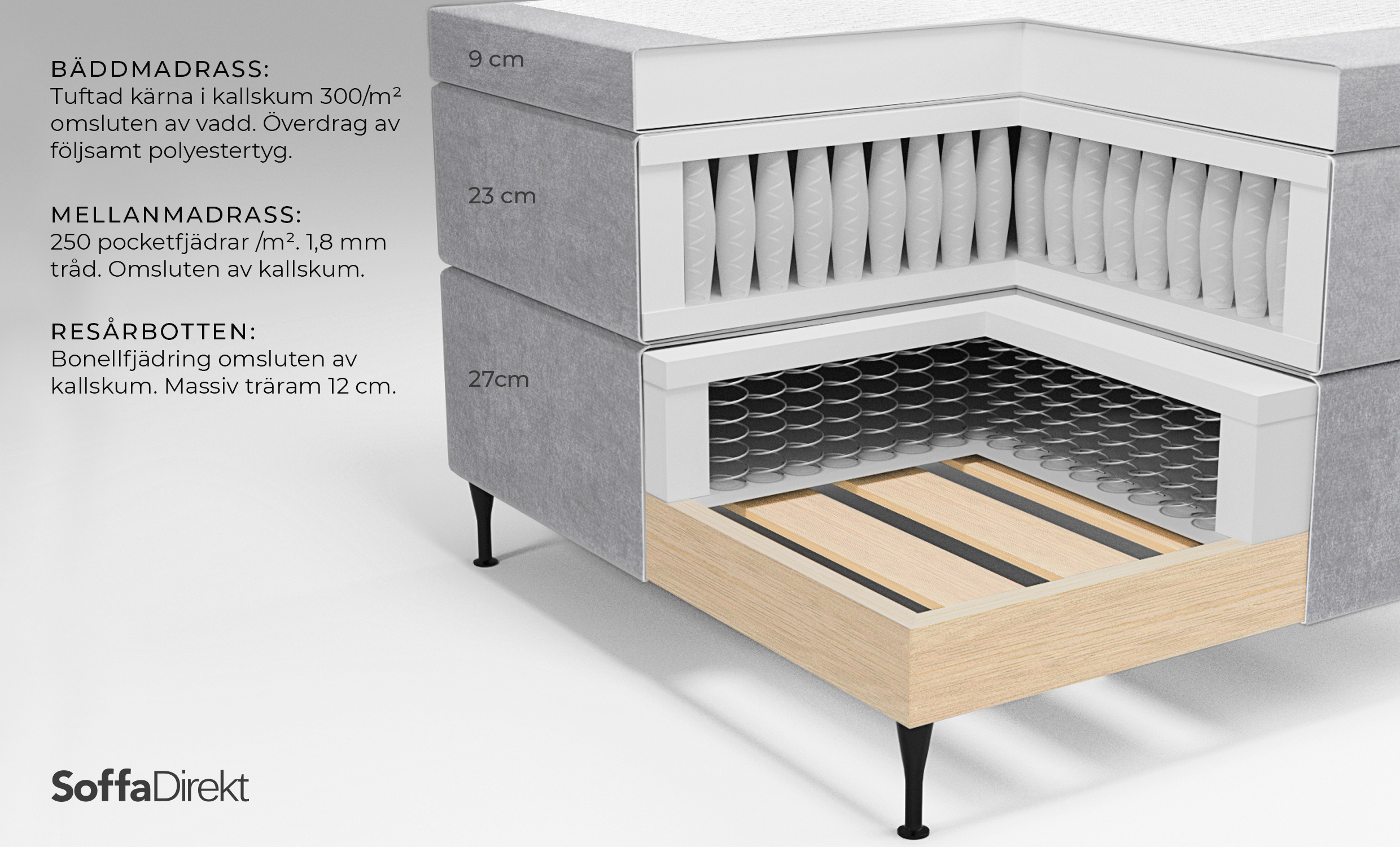- Mellommadrassen er 23 cm tykk med 7-soneinndeling for økt komfort.